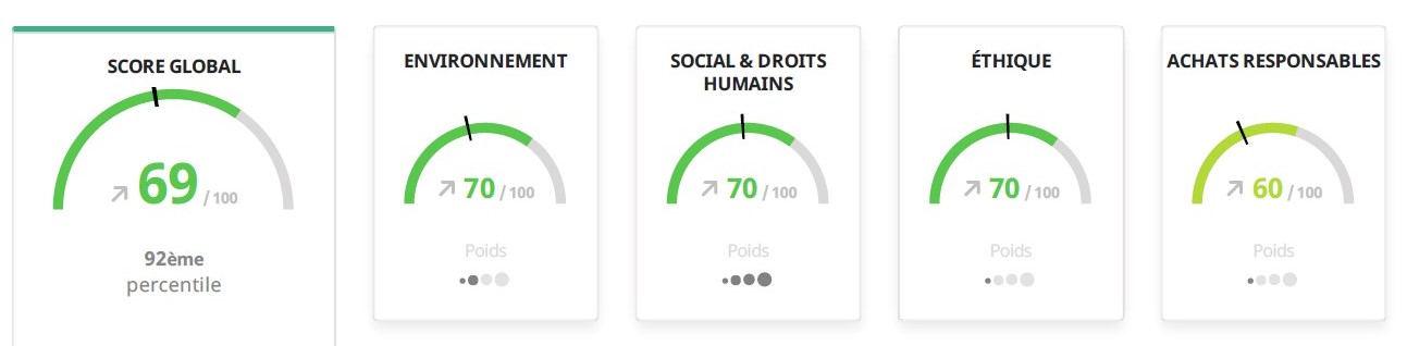 - Pour l’Ethique, nos chartes (anti-corruption, confidentialité des données personnelles) et notre formation cybersécurité obligatoire ont participé à notre progression dans cette catégorie (+20 points).