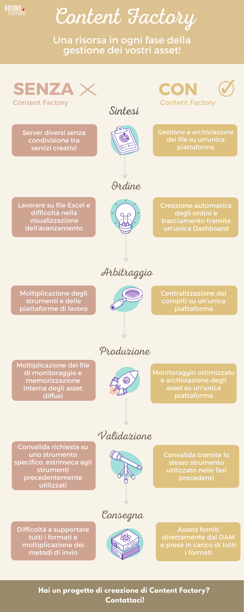 In questa infografica vi invitiamo a immergervi e a scoprire, per ogni fase, i vantaggi della creazione di una Content Factory.